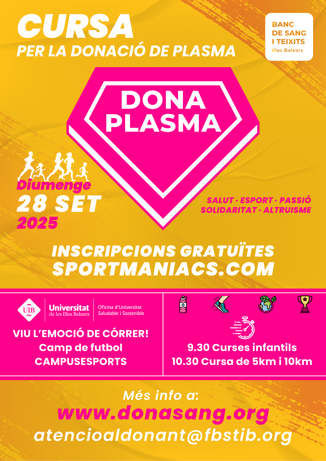 El Banc de Sang i Teixits de les Illes Balears (BSTIB) organitza la primera edició de la Cursa Dona Plasma, en col·laboració amb la Universitat de les Illes Balears (UIB). Una cita esportiva i de sensibilització que tindrà lloc el proper diumenge, 28 de setembre que arrencarà a les 09.30 hores al camp de futbol de CampusEsports de la UIB.