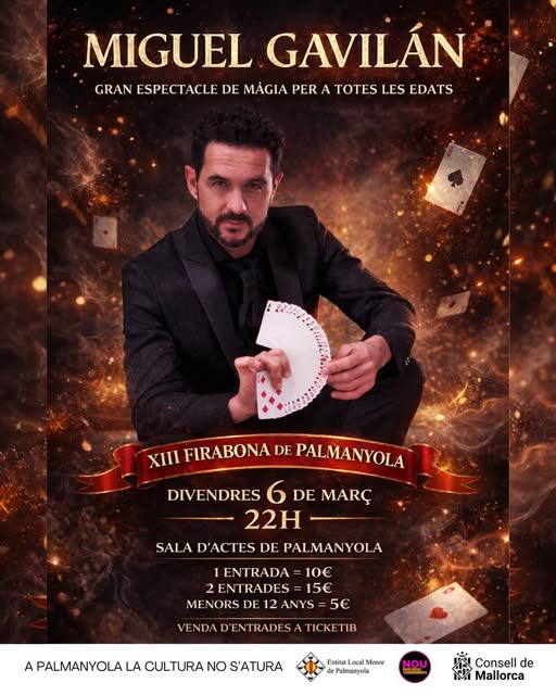 El DIVENDRES 6 DE MARÇ a les 22H, dins la XIII FIRABONA DE PALMANYOLA, arriba a la Sala d’Actes el gran MIGUEL GAVILÁN amb un GRAN ESPECTACLE DE MÀGIA I IL·LUSIONISME PER A TOTES LES EDATS